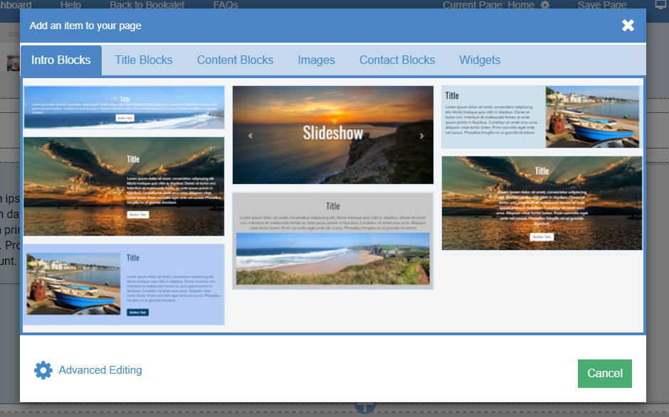 Background images, slideshows, titles, text blocks - quickly build up pages with common elements.